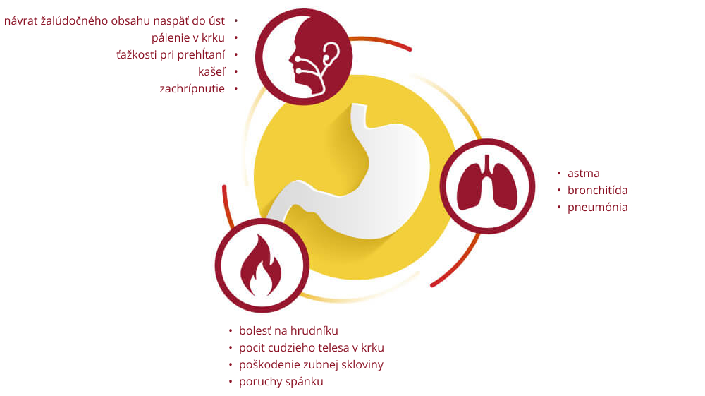 GERD môže tiež postihnúť orgány, ktoré nie sú priamo spojené s pažerákom, ako napríklad nos, uši, hrdlo a pľúca. Môže byť príčinou chronického kašľa, zápalu hrdla, zachrípnutia, astmy, alebo bolesti na hrudi nekardiálneho pôvodu.…. Tieto problémy sa nazývajú atypické príznaky GERD a odborne extraezofageálny GERD.